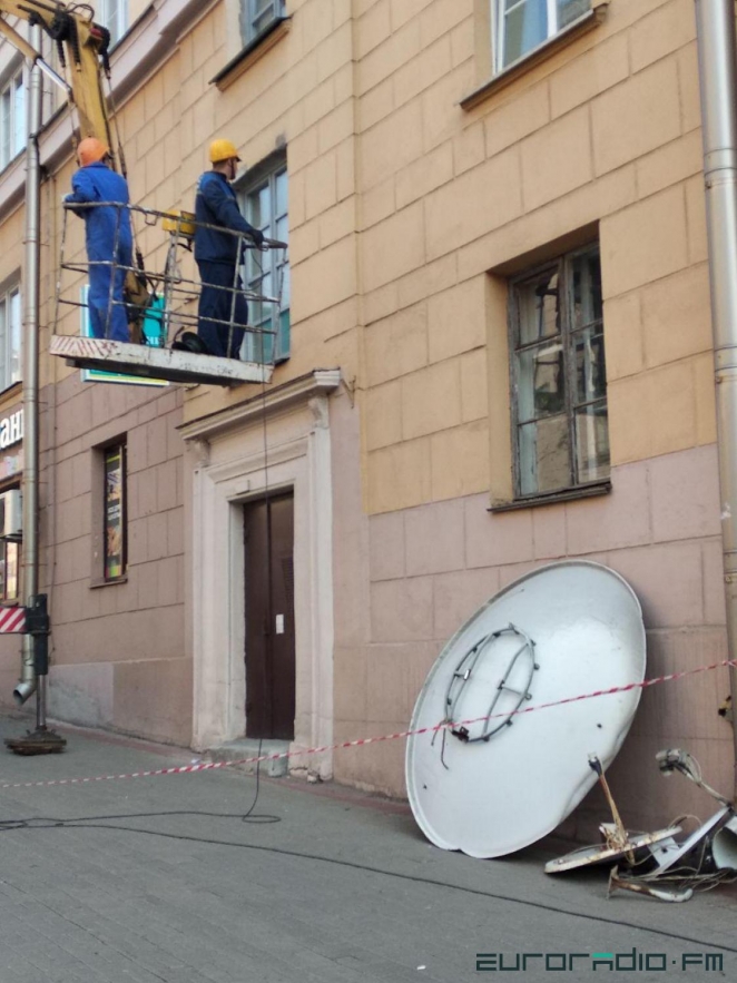 В комментарии Еврорадио рабочие объяснили, что демонтируют незаконно установленные тарелки в рамках подготовки к II Европейским играм. Тарелки, установленные законно, они не трогают.