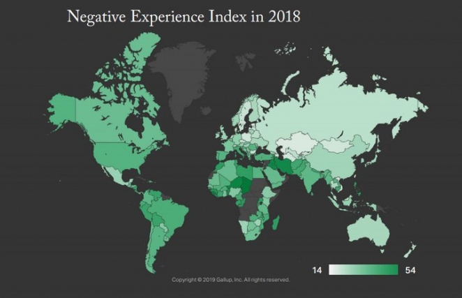 Также людей опрашивали по поводу негативных эмоций. У них уточняли, испытывали ли они беспокойство или стресс, грусть или гнев. Чаще всего с негативным опытом сталкивались в Чаде (уровень индекса негатива достиг цифры 54) и меньше всего в Тайване (уровень негатива — 14). Например, в Казахстане уровень негатива — 17, Польше — 18, а Латвии — 19.