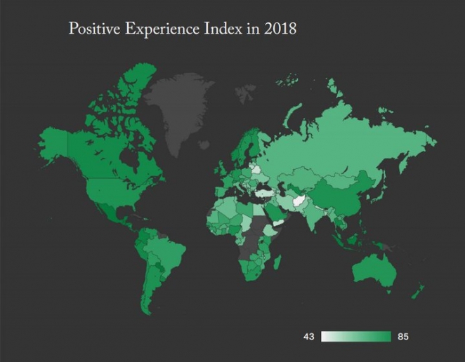В исследовании также анализируется позитивный опыт людей. Самыми непозитивными оказались жители Афганистана (уровень позитива 43), а самыми позитивными — Парагвая и Панамы. Их уровень — 85.