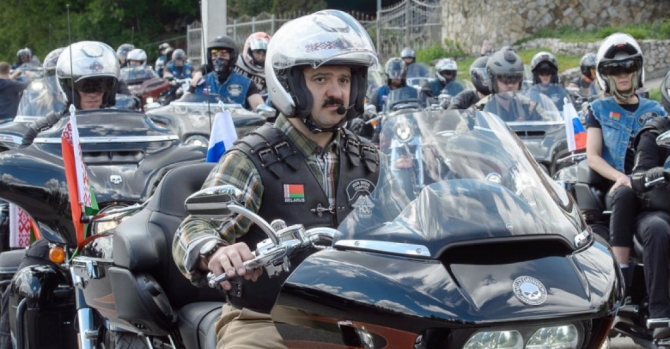 В составе белорусской группы 9 байков. На одном из них - 59-летний Иван Чура. Под огромной мохнатой шапкой, за зеркальными очками почти не видно лица.