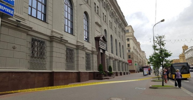 Вся пешеходная зона у входа в здание Нацбанка была огорожена. Около 12.30 оцепление начали снимать.