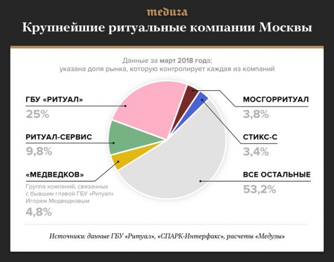 По состоянию на март 2018 года «Московская городская ритуальная служба» контролировала 25 % процентов рынка ритуальных услуг в столице России. Ritual.ru даже засветился в “ритуальном” антикоррупционном расследовании журналиста «Медузы» Ивана Голунова. Об этой организации там написано, в частности, следующее: «В начале 2015 года директором «Ритуала» был назначен старший оперуполномоченный Главного управления по противодействию коррупции и экономической безопасности МВД России Артём Екимов, который заявил, что его задача — очистить отрасль от криминала».