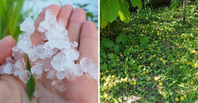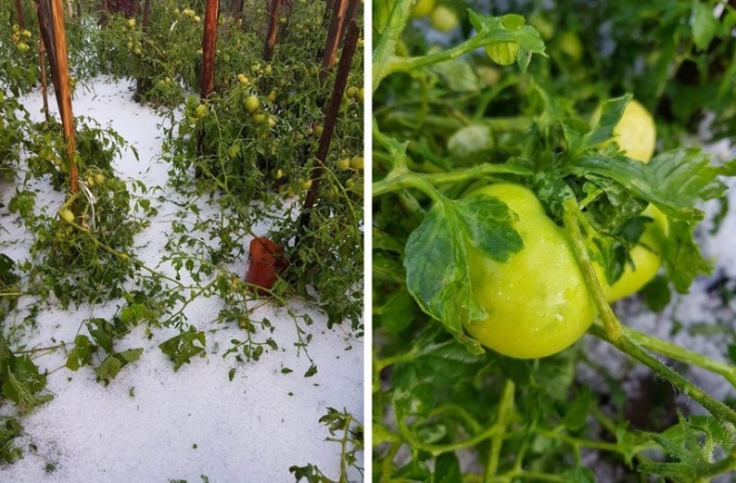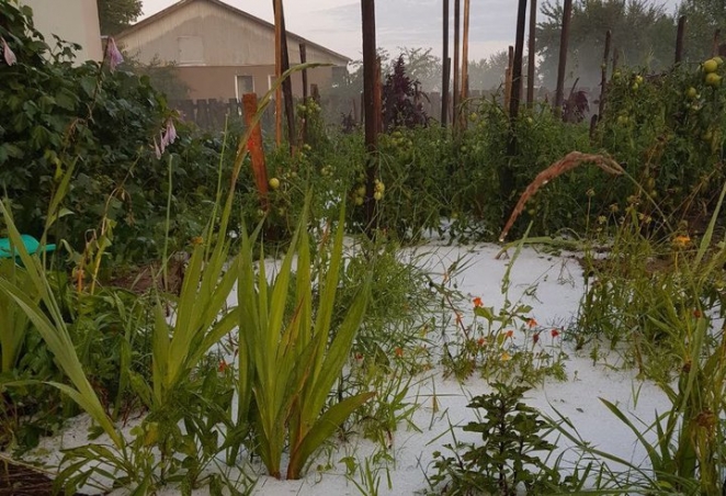 В ночь на 16 июля в агрогородке Копаткевичи (Петриковский район) прошел град. Клумбы и даже грядки помидоров оказались под ледяной крошкой. Град также сбил плоды на деревьях.