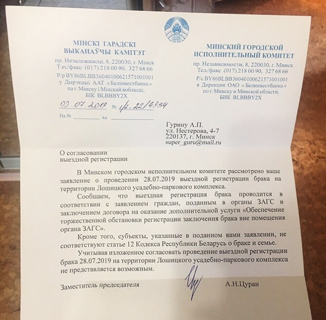 Он хотел провести торжественную церемонию в Лошицком парке, но чиновники ему отказали, сославшись на то, что выездная регистрация проводится на основе заявления граждан.