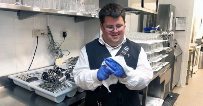 23-летний Василий Павликов с синдромом Дауна уже больше года работает официантом в минском отеле Renaissance Minsk. В его обязанности входит натирка столовых приборов для ресторана при отеле. Нареканий к работе парня у руководства отеля нет. "Василий всегда аккуратен, ответственно подходит к работе, вежливо общается с сотрудниками и очень пунктуальный", - говорит пиар-менеджер отеля Ольга Духович.