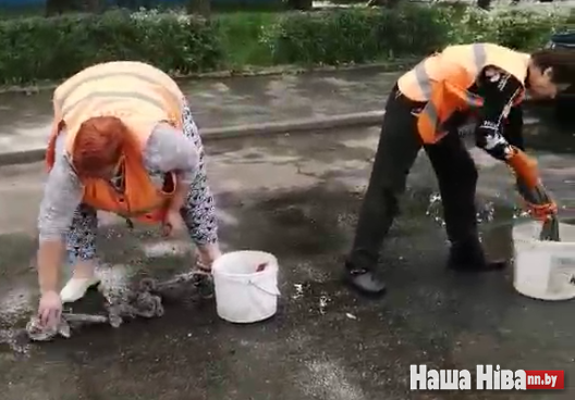 В Бобруйске коммунальные работницы сушили лужи тряпками, а потом туда положили асфальт