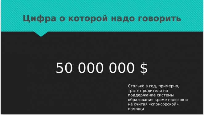 — Людям сегодня недостаточно говорить, что мы потратили на то-то такую-то сумму, им нужно, чтобы рассказали, как потратили, как искали подрядчика и т.д. Общество доросло, чтобы не только давать, но и требовать. Да, невозможно за один день изменить всю систему, но если сегодня каждый родитель поймет, что общий вклад их равен примерно 50 миллионов долларов в год на образование, то а я, думаю, что многое изменится, — заключает Андрей Дмитриев.