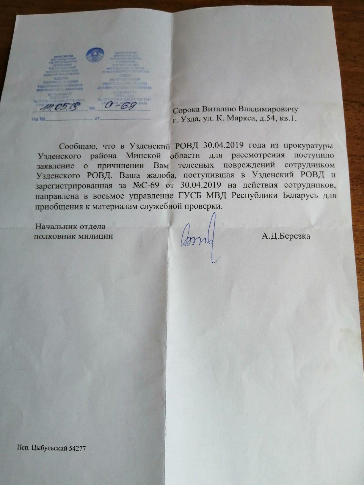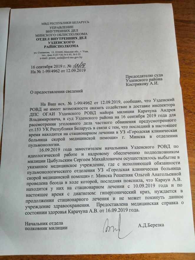Редакция belsat.eu пробовала взять комментарий у главы Узденского РОВД Андрея Берёзки, но он не ответил на звонки.