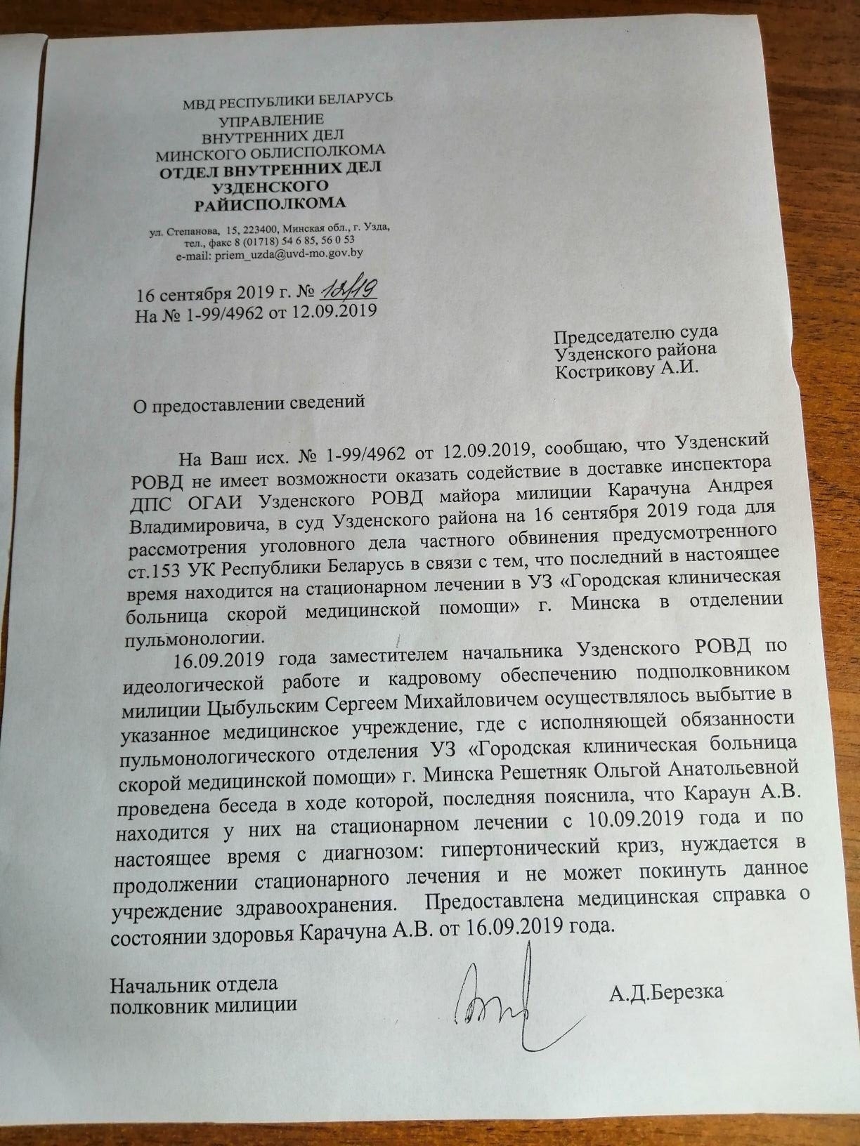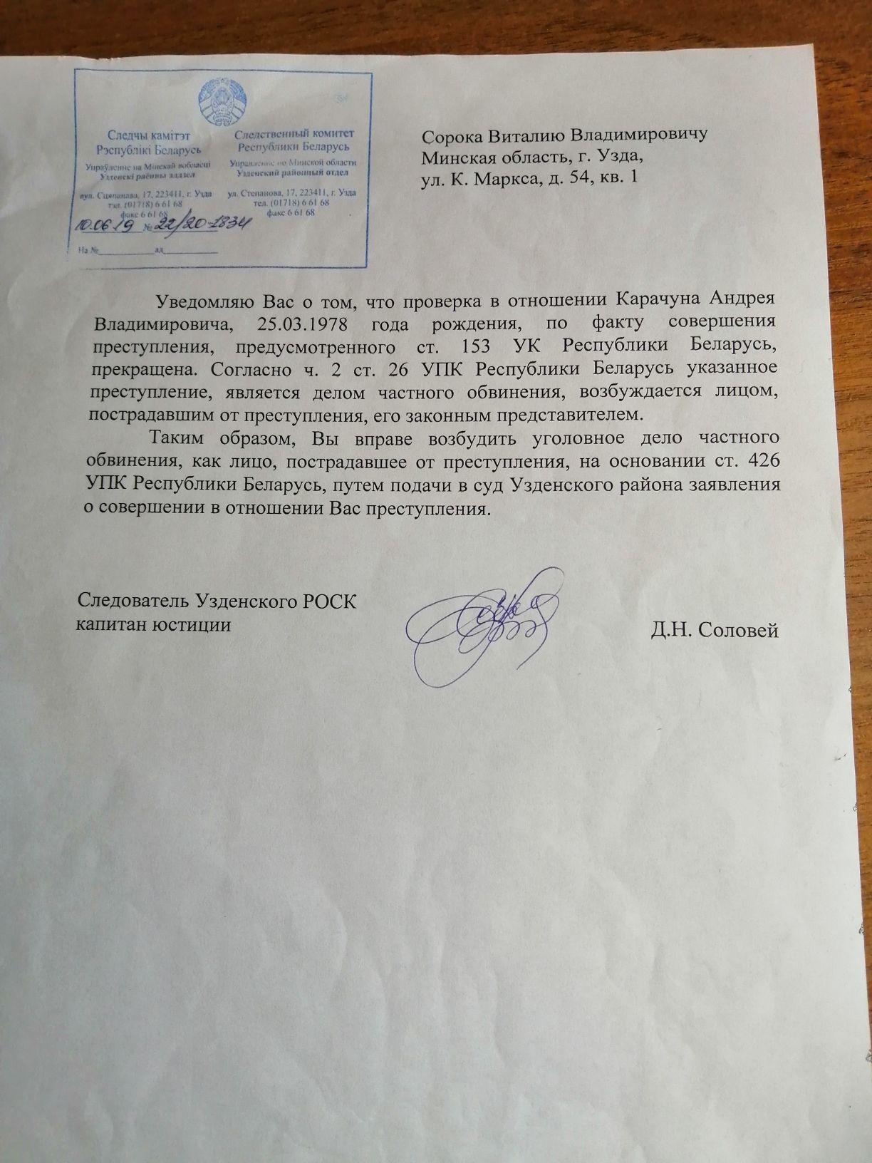 Виталий Сорока писал министру внутренних дел Юрию Караеву, но получил отписку из УВД Миноблисполкома, что больничные – настоящие, и больного нельзя привлечь к ответственности, пока он не выздоровеет. Также ему посоветовали самостоятельно найти Карачуна, чтобы доказать, что он обманывает. Такое поведение Виталий объясняет тем, что в ноябре Андрей Карачун досрочно выходит на пенсию.