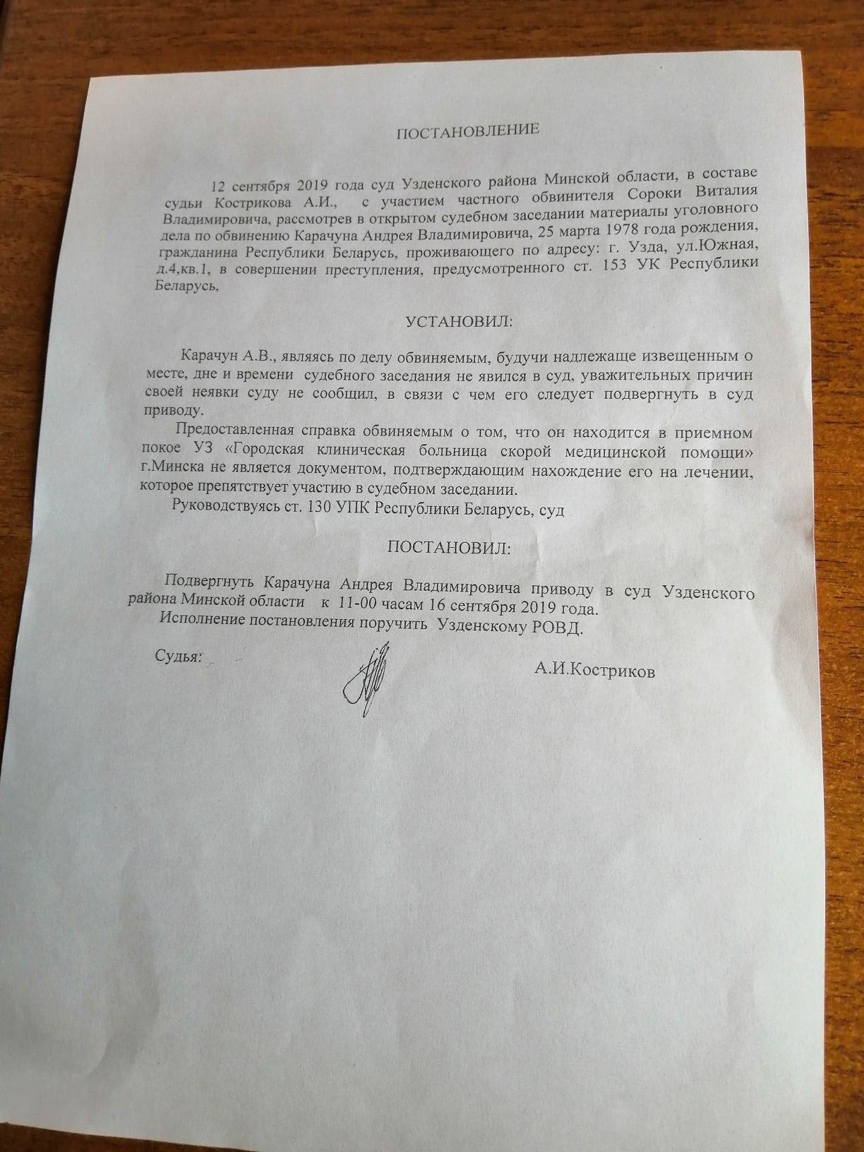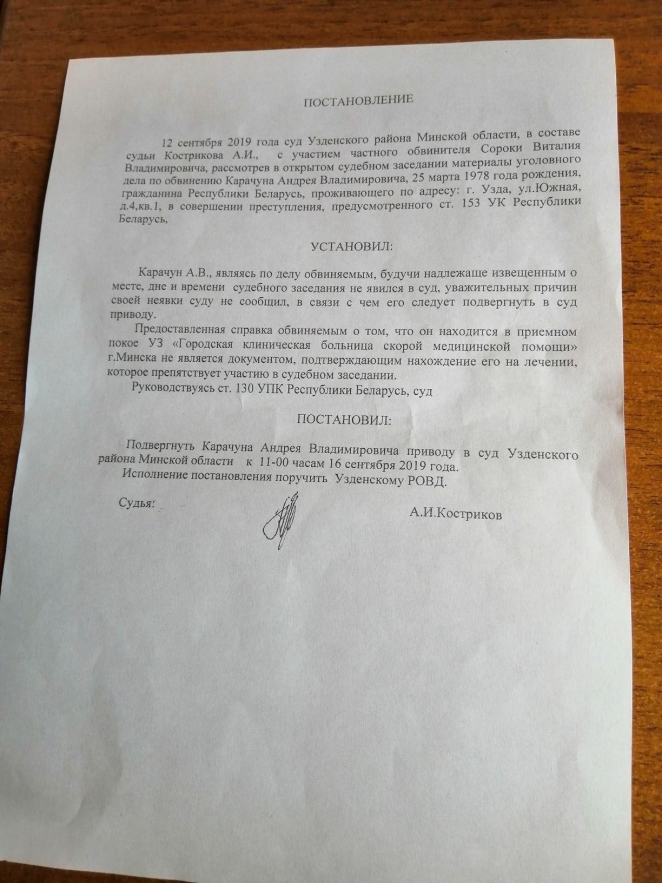 Постановление судьи о принудительном приводе Андрея Карачуна в суд