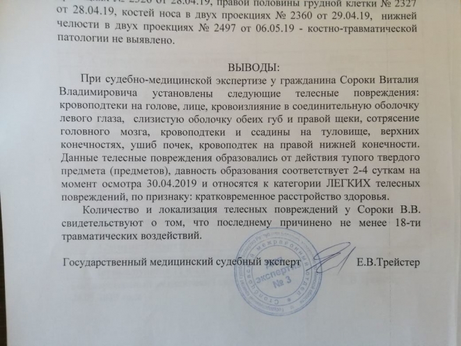 В местную больницу Виталия завезла жена. Мужчине сделали анализы и снимки, ночью он попал в палату хирургии. Следователь заверил мужчину, что в понедельник 29 апреля его направят на судебно-медицинскую экспертизу, но и медики, и правоохранители, уверен Сорока, старались помешать ему попасть к специалисту:
