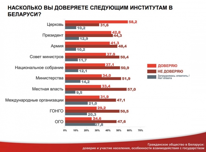 В то же время опасения части населения подтверждает тот невысокий уровень доверия государственным институтам, который неоднократно показывали результаты различных опросов. Одним из последних было социологическое исследование 2018 года «Гражданское общество в Беларуси: доверие и участие населения, особенности взаимодействия с государством», из которого следует, что больше половины граждан не доверяют местным органам власти и министерствам.
