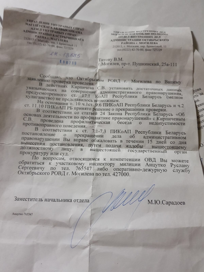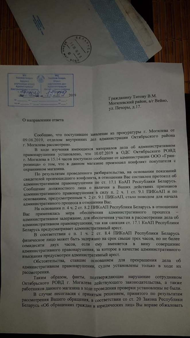 Виталий обратился в Октябрьский РОВД, проверку вел тот же участковый, который задерживал мужчину. Руслан Анцутко прислал могилевчанину ответ, что нарушений в действиях продавцов и охранника нет.