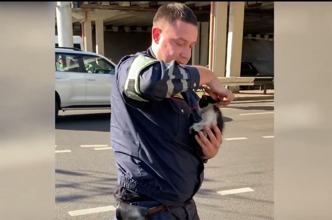 Сотрудник ДПС Андрей Герман со спасенным котенком. Фото: скриншот видео с портала minsknews.by