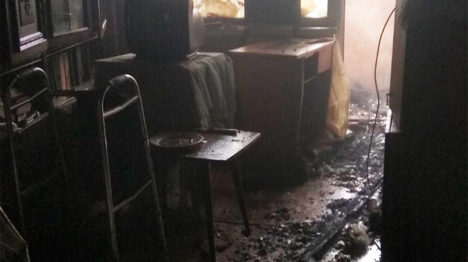 Огонь повредил имущество в комнате, закопчена квартира. Предварительная причина пожара – неосторожное обращение с огнем при курении.