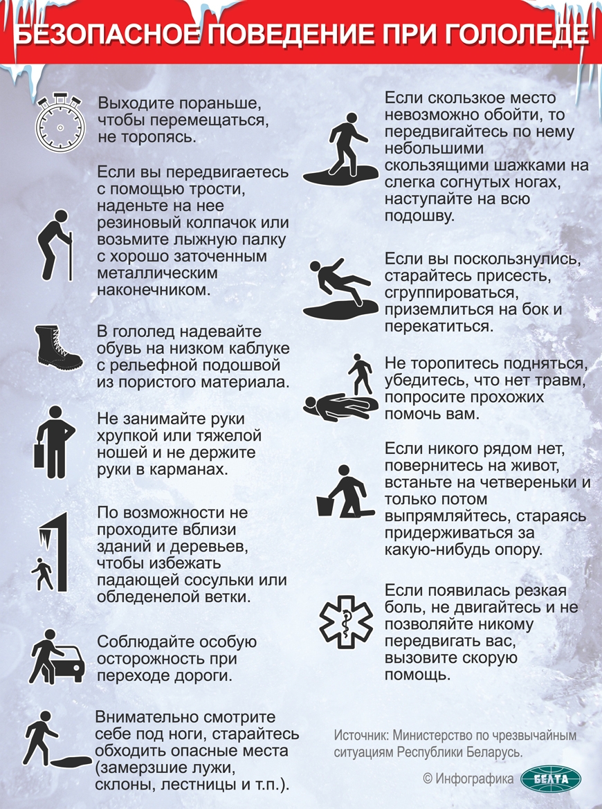 В Минздраве напомнили несколько правил, соблюдение которых поможет избежать падения и тяжелых травм в гололед. Передвигаться на скользком тротуаре нужно медленно, короткими шагами. Обувь должна соответствовать погоде. Желательно, чтобы подошва была ребристой. Женщинам на время гололеда лучше полностью отказаться от высоких каблуков и шпилек. При падении нельзя выставлять в стороны руки или ноги - в этом случае они принимают на себя всю силу удара. Необходимо сгруппироваться, а падать желательно на бок, избегая падения на спину, удара затылком.
