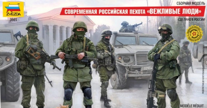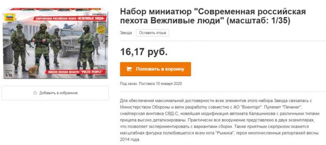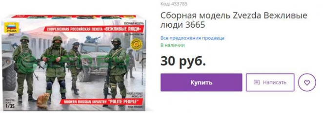 Продавцы напоминают, что так называемые «вежливые люди» появились в Крыму в конце февраля 2014 года — перед оккупацией полуострова. Кстати, позже президент России Владимир Путин признал, что это были российские войска. «Вежливые люди» стали таким же символом оккупации и «русского мира», как и, например, георгиевские ленты.