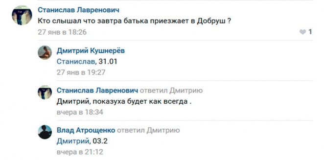 О приезде Александра Лукашенко пишут подписчики добрушских пабликов Вконтакте. Звучат разные даты: 31 января и 3 февраля.