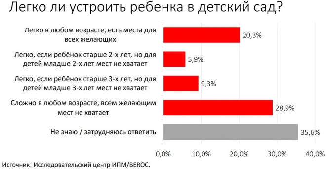 Как прокомментировала этот результат в ходе презентации исследования академический директор BEROC Катерина Борнукова, «20% живут в какой-то волшебной стране, где для устройства ребенка в детский сад нет вообще никаких проблем».