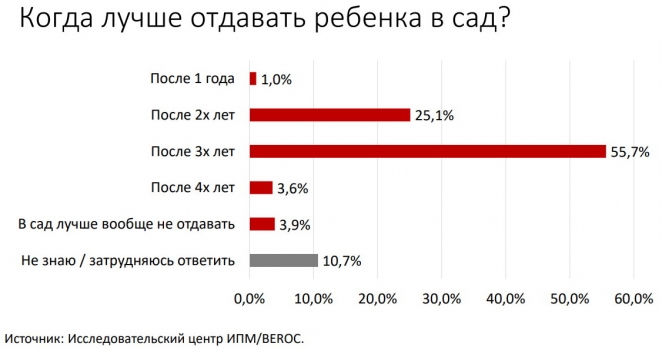 В то же время на вопрос: «Когда лучше отдавать ребенка в сад?» 55,7% опрошенных ответили – после 3-х лет.