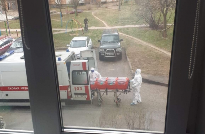 Могилевчане прислали в группу «Могилев Live» фото, как такая же бригада в защитных костюмах 5 апреля забирает человека в боксе на улице Турова. За процессом следил сначала весь дом, а затем и весь город, ведь фото и видео попали в социальные сети.