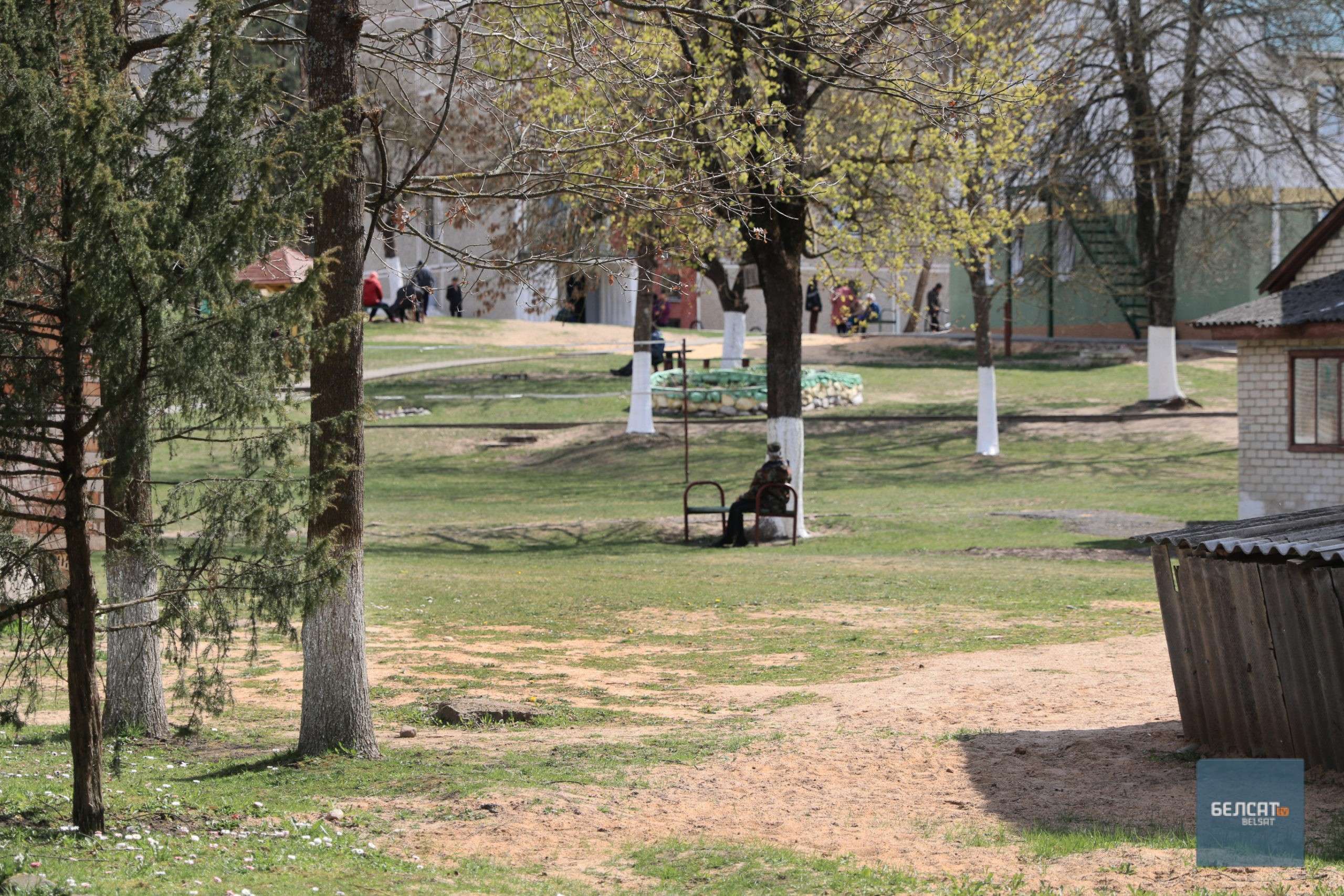 Возвращаясь назад, проходим через общежитие. На территории сейчас не пусто, через ворота видим чуть более десятка человек. Это проживающие вышли на прогулку.