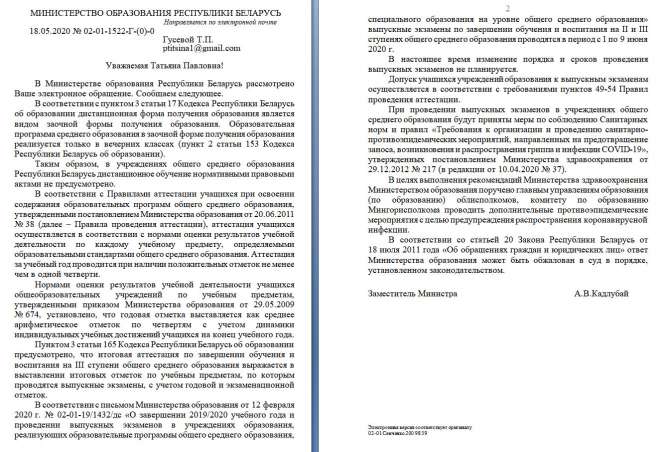 Согласно ответу за подписью заместителя министра Александра Кадлубая, в учреждениях общего среднего образования дистанционное обучение нормативными правовыми актами не предусмотрено.