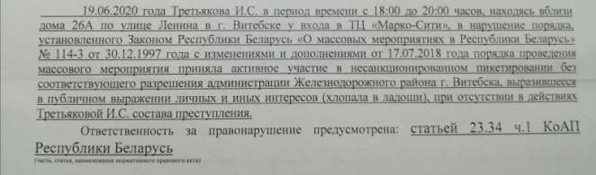 Ее задержал сотрудник Октябрьского РОВД С. Веракса, но доставил в Прешамайский РОВД, где наблюдательнице вручили уже составленный заместителем начальника отдела охраны правопорядка и профилактики данного ОВД В. Склименком протокол по ст. 23.34 КоАП. По версии милиции, Ирина Третьякова приняла участие в несанкционированном массовом мероприятии, которое состоялось 19 июня в Витебске у входа в торговый центр «Марк-Сити», где якобы хлопала в ладоши.