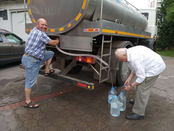 Через несколько кварталов отсюда так же одиноко стоит еще одна машина с водой. Время от времени сюда подходят люди с бутылками и самостоятельно наливают воду из Боровлян. В кабине спит водитель. Проснувшись, он рассказывает, что стоять здесь будет до вечера, а насчет завтра не знает.