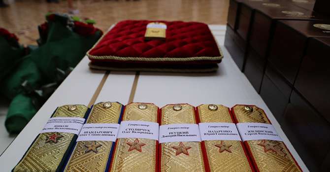 Указы о присвоении воинских, специального и персонального званий Лукашенко подписал 18 июня. Очередные воинские звания генерал-майора присвоены полковникам Виктору Гулевичу, Юрию Назаренко, Дмитрию Реуцкому, Олегу Столярчуку и Сергею Жилинскому.