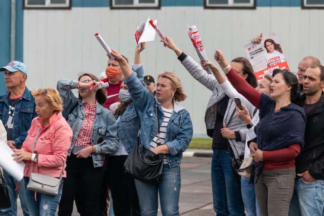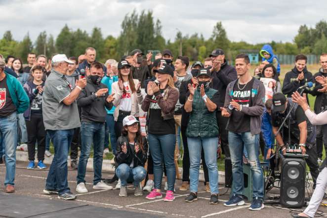 Заметно, что у людей действительно накипело, и они на пикете в поддержку Тихановской высказывают все, что думают. В конце пикета люди поднялись с трибун и вышли к команде «Страны для жизни», чтобы все вместе спеть песню «Разрушь стены тюрьмы».
