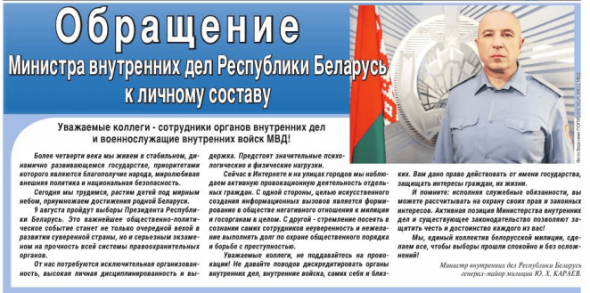 Как сообщила TUT.BY пресс-секретарь МВД Ольга Чемоданова, обращение было записано еще на прошлой неделе, его печатную версию опубликовали в одном из номеров газеты «На страже».