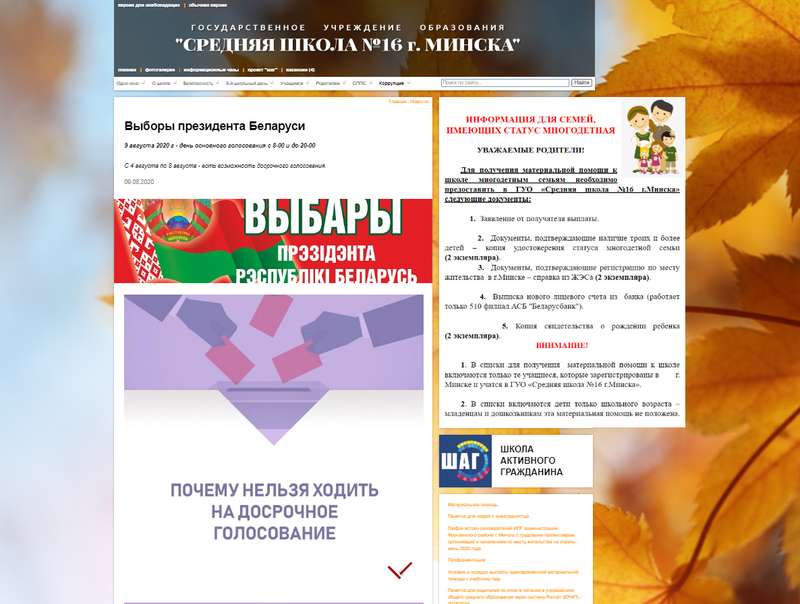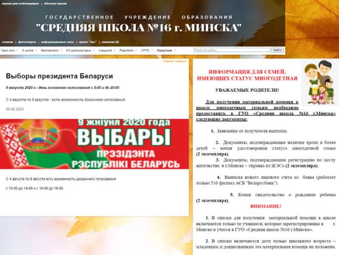 Затем картинки, хейтящие досрочное голосование, с сайта 16-й школы таинственно исчезли (видимо, с позицией учреждения они все-таки не совпали). Сейчас вкладка «Выборы президента Беларуси» выглядит уже опустевшей, но интернет-то все помнит.