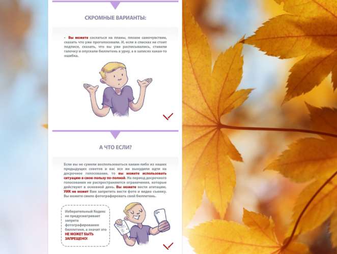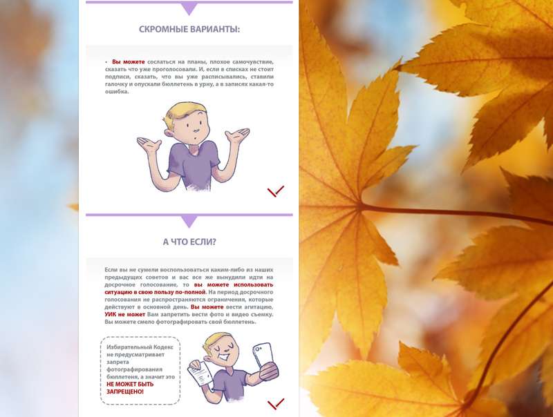 Так, картинки объясняли, что, вероятнее всего, основные махинации с бюллетенями происходят именно во время «досрочки», поэтому идти на нее никак нельзя. А принуждение проголосовать досрочно – незаконно. Также в инструкциях советовали, как именно избежать досрочного голосования, если явиться на него заставляют. Вот скриншоты: