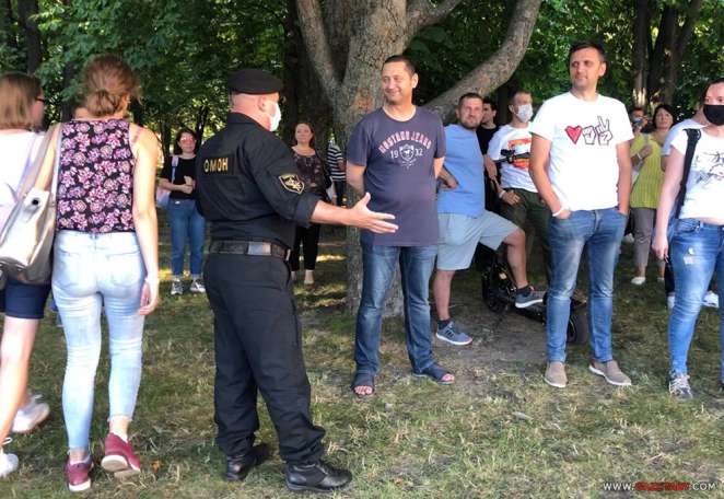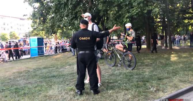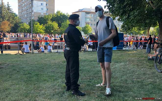 Около 19.00 омоновец чаще других коллег подходил к людям, не проходящим через КПП и стоящим за пределами ограждения центральной части со сценой Киевского сквера.