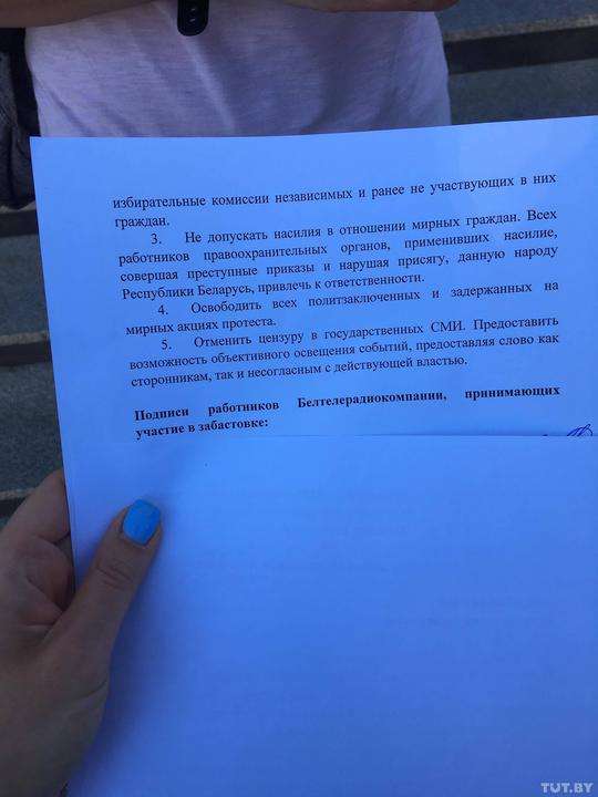 Глава Белтелерадиокомпании Иван Эйсмонт к бастующим пока не вышел. Он дал операторам час на то, чтобы решить, будут они увольняться или нет. Сотрудники заявляют, что они будут стоять, сколько нужно, и сами решат, увольняться ли им.