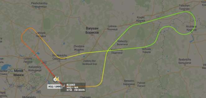 Самолет Boeing 737 с бортовым номером EW-001PA (точно известно, что это один из двух бортов, на котором летает во время визитов Александр Лукашенко) около 11 утра вылетел из Национального аэропорта Минск в восточном направлении. Некоторое время борт сохранял курс, однако потом развернулся в районе Круглого Могилевской области и полетел обратно к Минску.