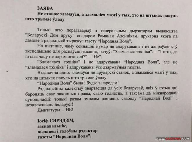 Белорусский дом печати отказался печатать и «Народную волю». Вот этот номер!