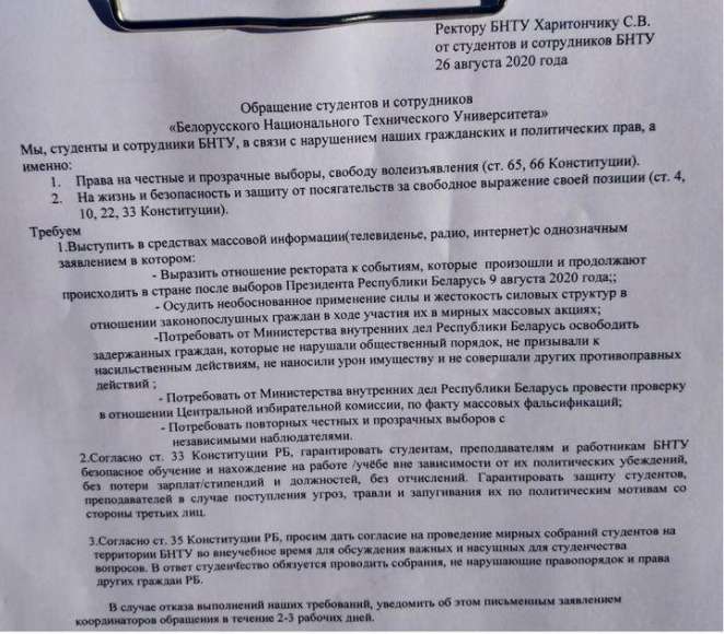 — Мы решили, что мы солидарны со студентами БГУ, которые к тому моменту уже подготовили свою петицию. В нашем обращении мы просили, чтобы ректор высказался по поводу событий в стране, осудил применение насилия, — перечисляет пункты документа Ксения. — Предлагали, чтобы независимо от политической позиции, студентам гарантировали безопасное нахождение на территории университета, а также разрешили собираться на территории БНТУ для обсуждения важных вопросов. Важных — не значит только политических.