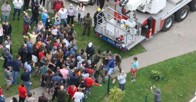 В жилом комплексе «Каскад», где хотят снять бело-красно-белые флаги, идет противостояние местных жителей и неизвестных в костюмах цвета хаки и в балаклавах. Неизвестные при поддержке ОМОН пытаются оттеснить жителей двора. Читательница TUT.BY сообщает, что пока все проходит без задержаний.