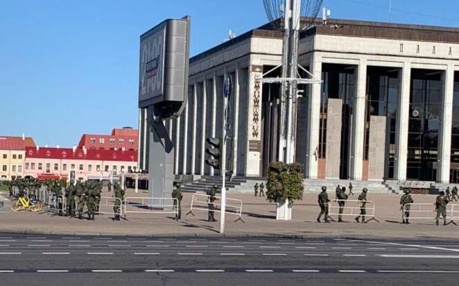 Металлическими ограждениями перекрыли подходы к Александровскому скверу, за которым находится Купаловский театр и здание администрации президента. Закрыты подходы на Октябрьскую площадь и площадь Независимости. Возле Стелы замечены водомёты.