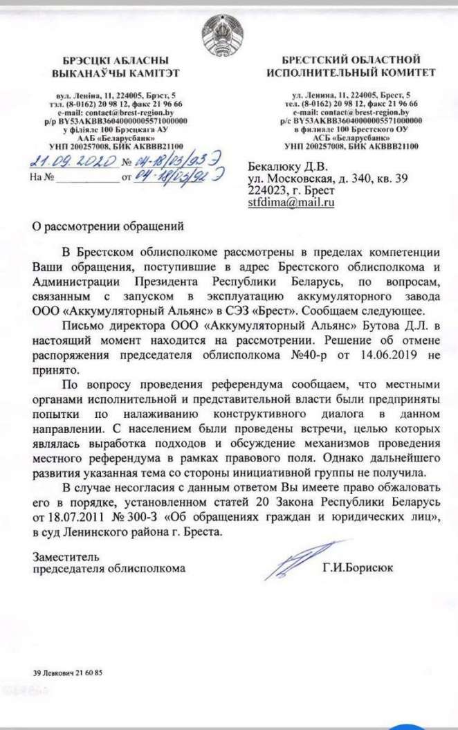 Ответ Брестского облисполкома / @AndrewBoshel