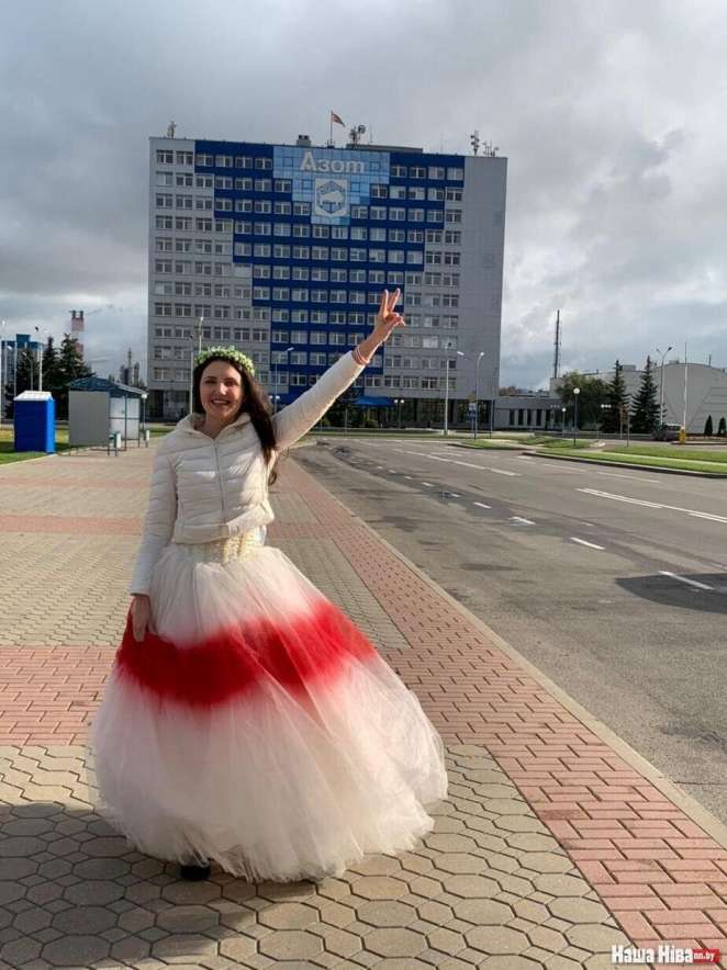 Яна прыходзіла на акцыі супраць фальсіфікацый і беззаконня ў сукенцы нявесты. Сёння яна прыехала ў Гродна на таксі спецыяльна, каб падтрымаць работнікаў «Азота». Фота яе з Гродна даслаў чытач «Нашай Нівы».