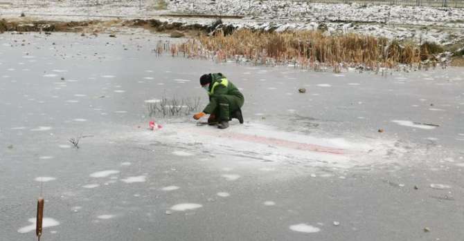 «Спецоперация» в Уручье: сотрудник «Зеленстроя» рубил лед, чтобы достать вмерзший БЧБ-флаг