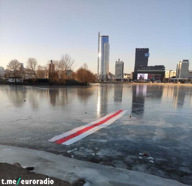 Минчане продолжают замораживать и рисовать БЧБ-флаги прямо посреди Свислочи. Этот - в самом центре Минска!