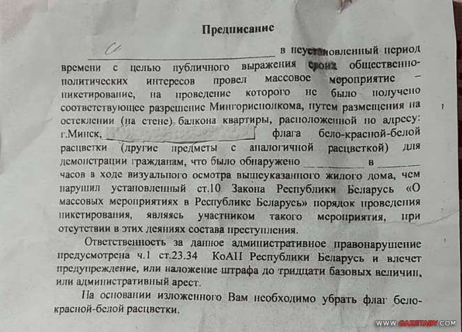 В послании говорится, что «в неустановленный период времени с целью публичного выражения общественно-политических интересов» на балконе по указанному адресу прошло «массовое мероприятие — пикетирование, путем размещения на остеклении флага бело-красно-белой расцветки (другие предметы аналогичной расцветки) для демонстрации гражданам».