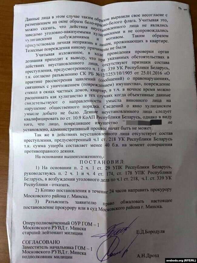 «В ходе проверки орган уголовного преследования приходит к выводу, что в настоящее время, в связи с политическими событиями в стране, среди лиц из числа гражданского общества, имеются лица, которые негативно относятся к бело-красно-белой символике», — говорится в ответе из милиции.