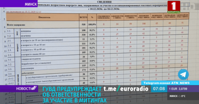 В утренних новостях за 23 января в кадр попал экран компьютера с внутренней милицейской статистикой по задержанным во время акций протеста. Данные собирались с 10 по 18 декабря.