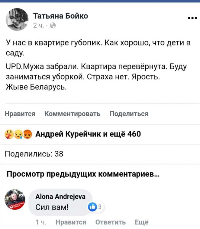 UPD. Мужа забрали. Квартира перевёрнута. Буду заниматься уборкой. Страха нет. Ярость. Жыве Беларусь, — написала Татьяна.