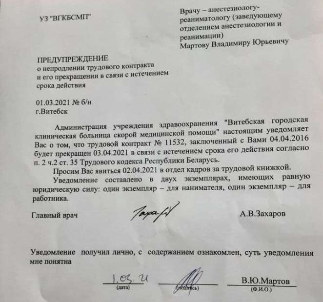 1 марта Владимир Мартов получил уведомление от администрации БСМП о том, что с 3 апреля с ним не продляют трудовой контракт — «в связи с истечением срока его действия». Владимир Мартов подтвердил эту информацию: